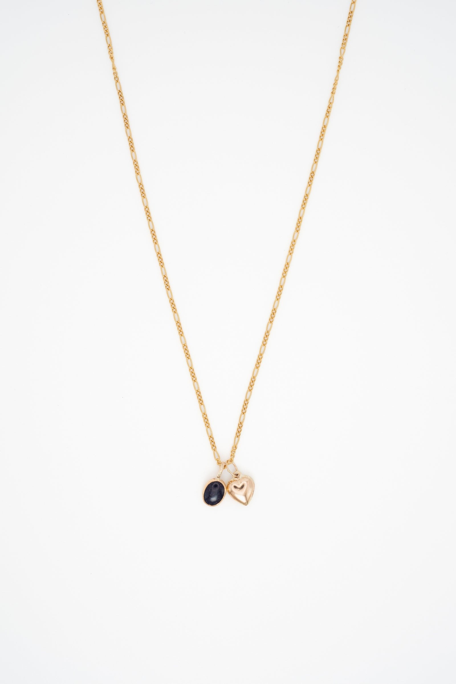 Collier 18" chaîne figaro en or rempli avec deux breloques, dont un coeur en or rempli et le choix d'une pierre ovale sertie en or rempli. Avec rallonge de 2.5".