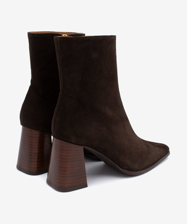 Bottillons à talon. Bout pointu/carré. Fermeture à zip. Talon carré de 7 cm. Tissu suède