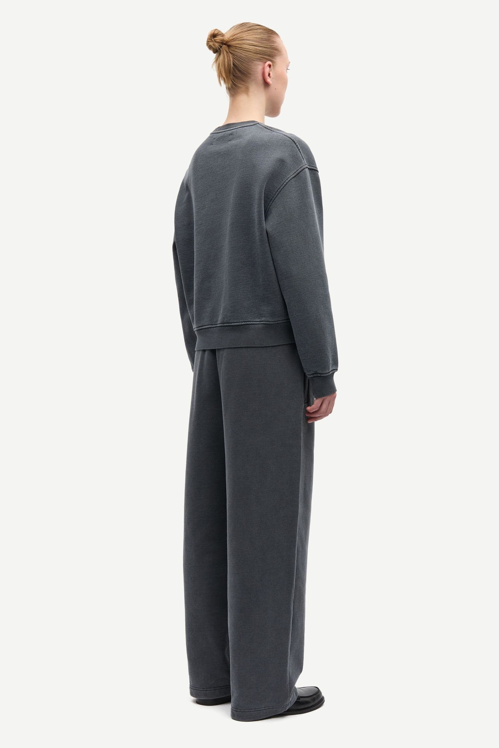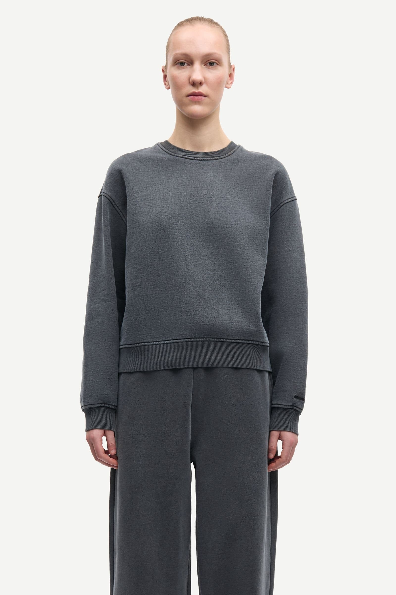 Chandail sweatshirt. Col rond. Coupe légèrement oversized. Couture des épaules basse.