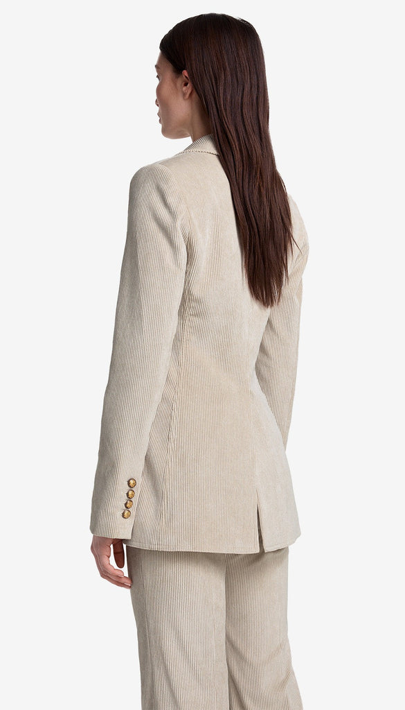Veston mi-long en corduroy. Grandes poches à l'avant. Fermeture à un bouton.