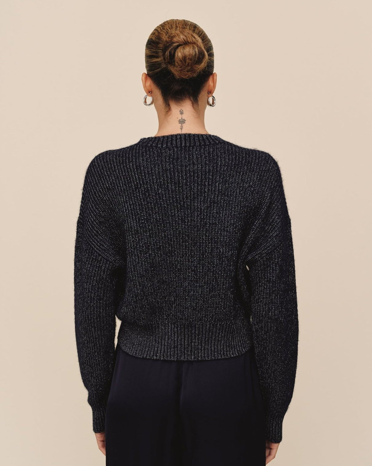 Pull à col rond. Coupe légèrement plus courte. Fil un peu brillant.