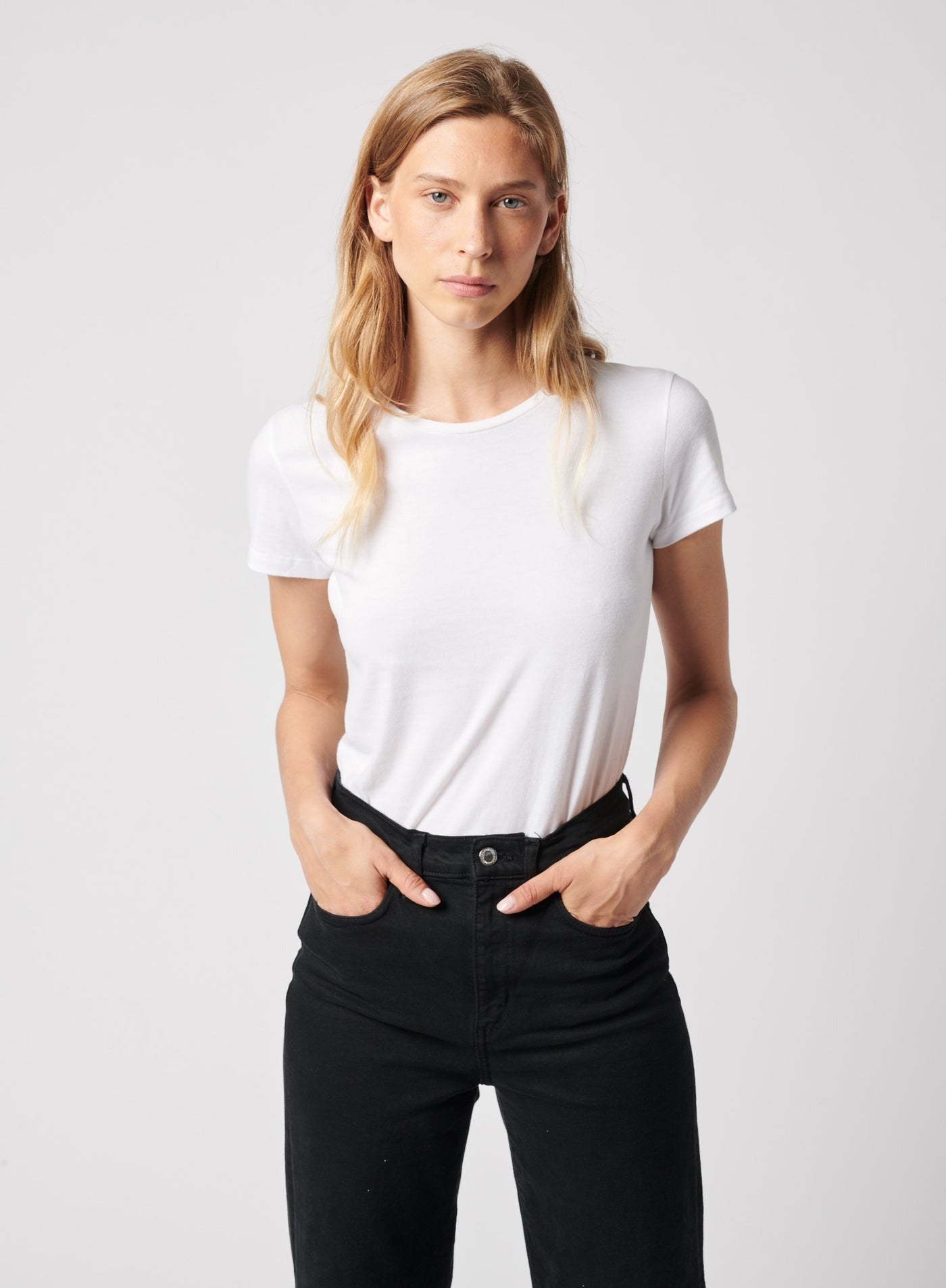 T-shirt classique. Col rond. Tissu très doux. Tissu mince. Coupe près du corps.