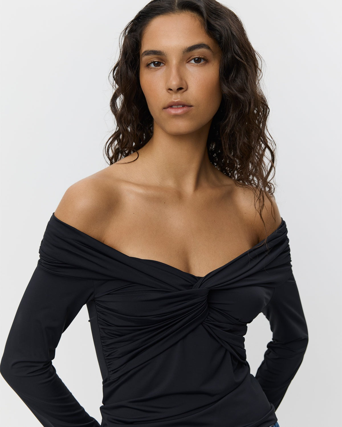Top à manches longues. Off the shoulder. Croisé au niveau de la poitrine. Coupe près du corps.
