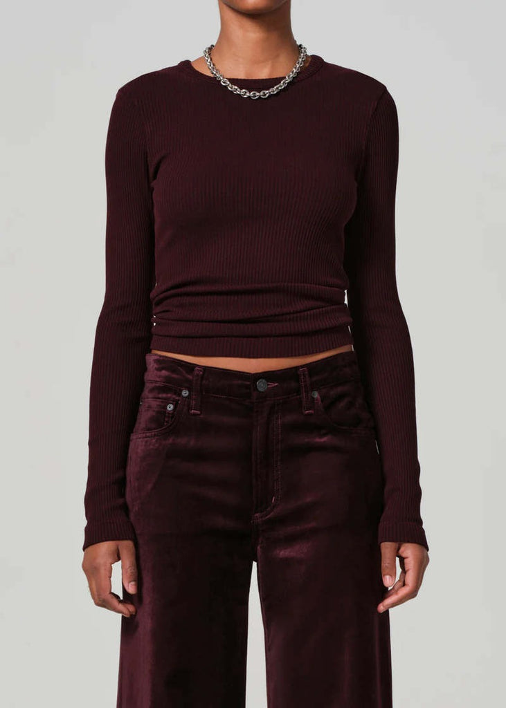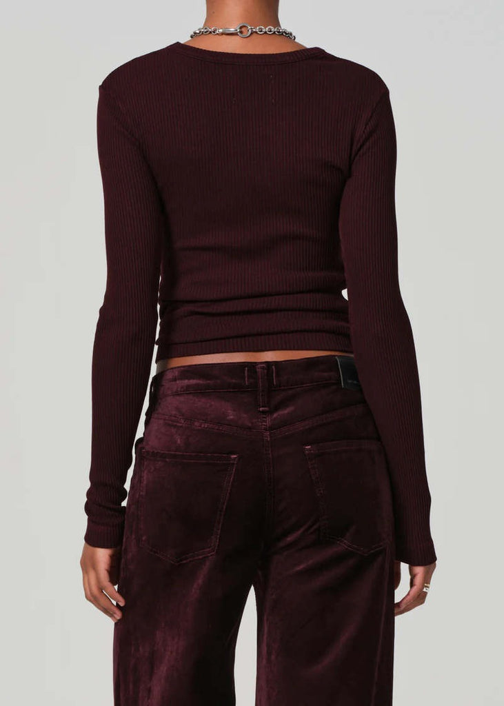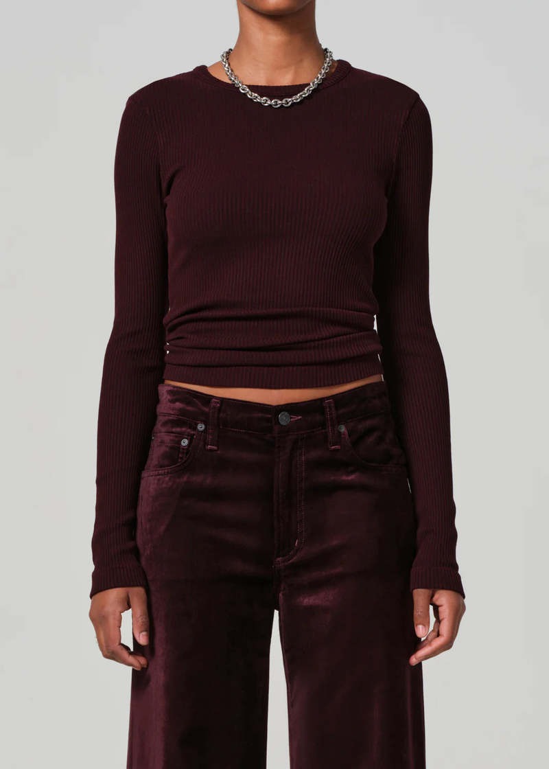 Chandail à manches longues. Coupe près du corps. Col rond.