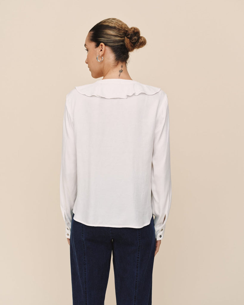 Chemisier léger à manches longues. Col en V. Ondulations au col. Fermeture à boutons nacrés.