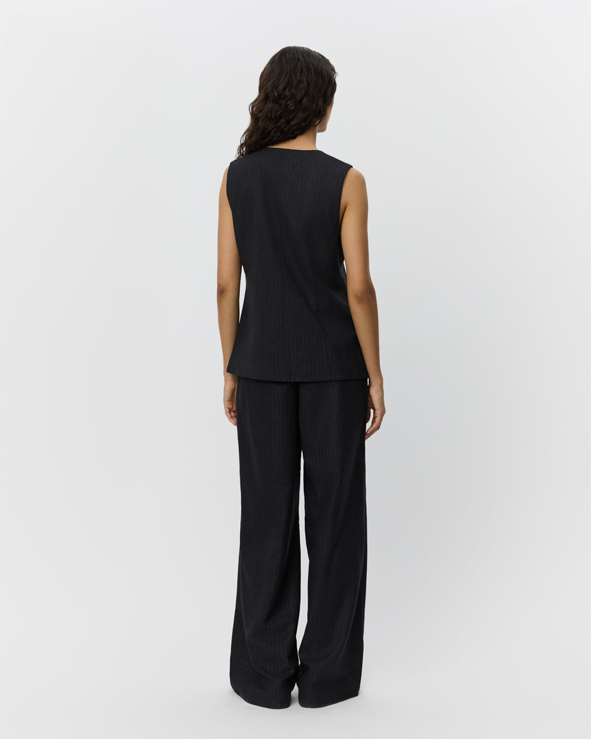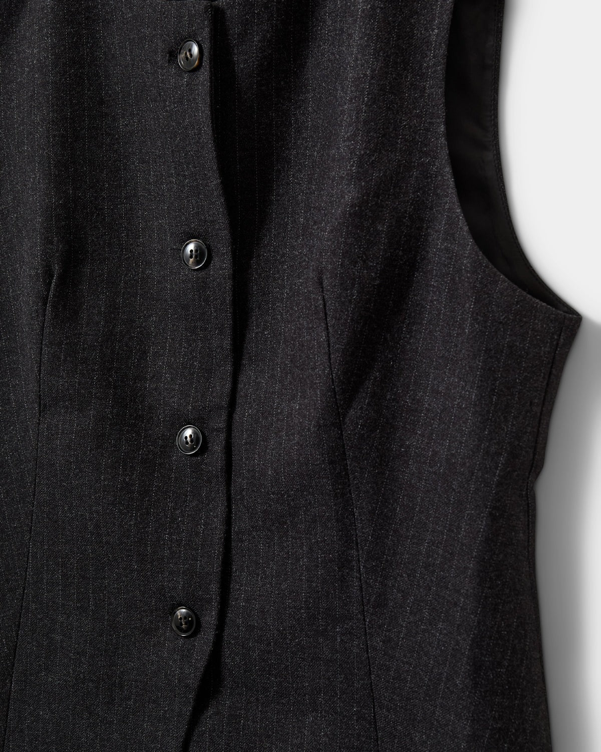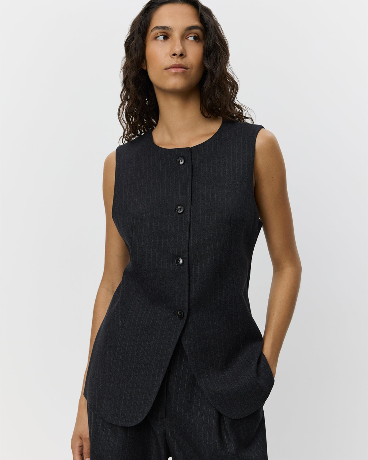 Veste débardeur sans manches. Fermeture à boutons à l'avant. Fines rayures dans le tissu.