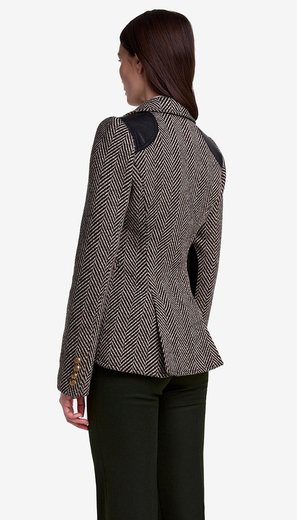 Veston en mélange de laine. Patch de cuir au niveau des épaules et des avant-bras. Poches à l'avant. Fermeture à boutons.