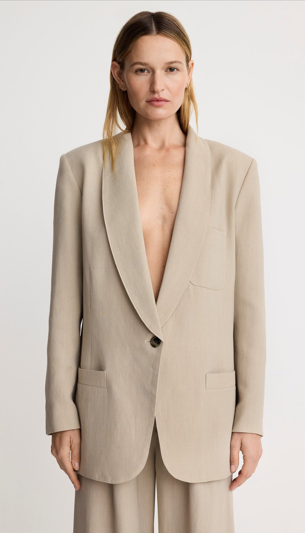 Veston oversized. Col bas. Fermeture à un bouton à l'avant. Poches de chaque côté à l'avant.